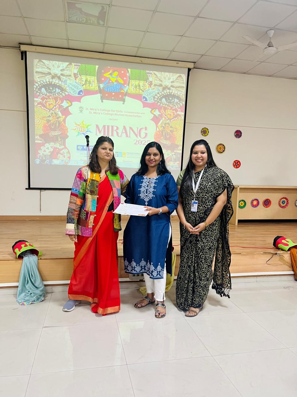 St. Mira’s College for Girls in collaboration with St. Mira’s Alumni Association organized a three-day Annual Intercollegiate Fest Mirang 2025 on 18th, 19th and 20th December 2025. The fest received an overwhelming response of 200 registrations across the different colleges in Pune. Students from different Junior Colleges and the Senior Colleges participated in the events organized by the Miraites. The Fest consisted of different events, Mira Bazaar, Happy Streets and Teklogica. The events hosted comprised of Quiz, Elocution, Fashion Show, Mad Ads, Poetry-Open Mic, Rap-it-up, Nukkad Natak, Group Dance, Meme-it, Shark Tank, Stand-up Open Mic, Photography, Cosplay, Group Singing and Battle of Bands. Mirang 2025 was inaugurated by the Chief Guest Dr. Kavita Rao (MD & CEO - Global Investment Banking and Mrs Asia World 2023) and the Guest of Honour Mrs. Noopur Pawar, President Alumni Association (Founder & Partner of Kalagram Company, Lawyer & councilor). The College also invited renowned people as judges. The Fest was concluded by a live orchestra show performed by the band-The Raaz.